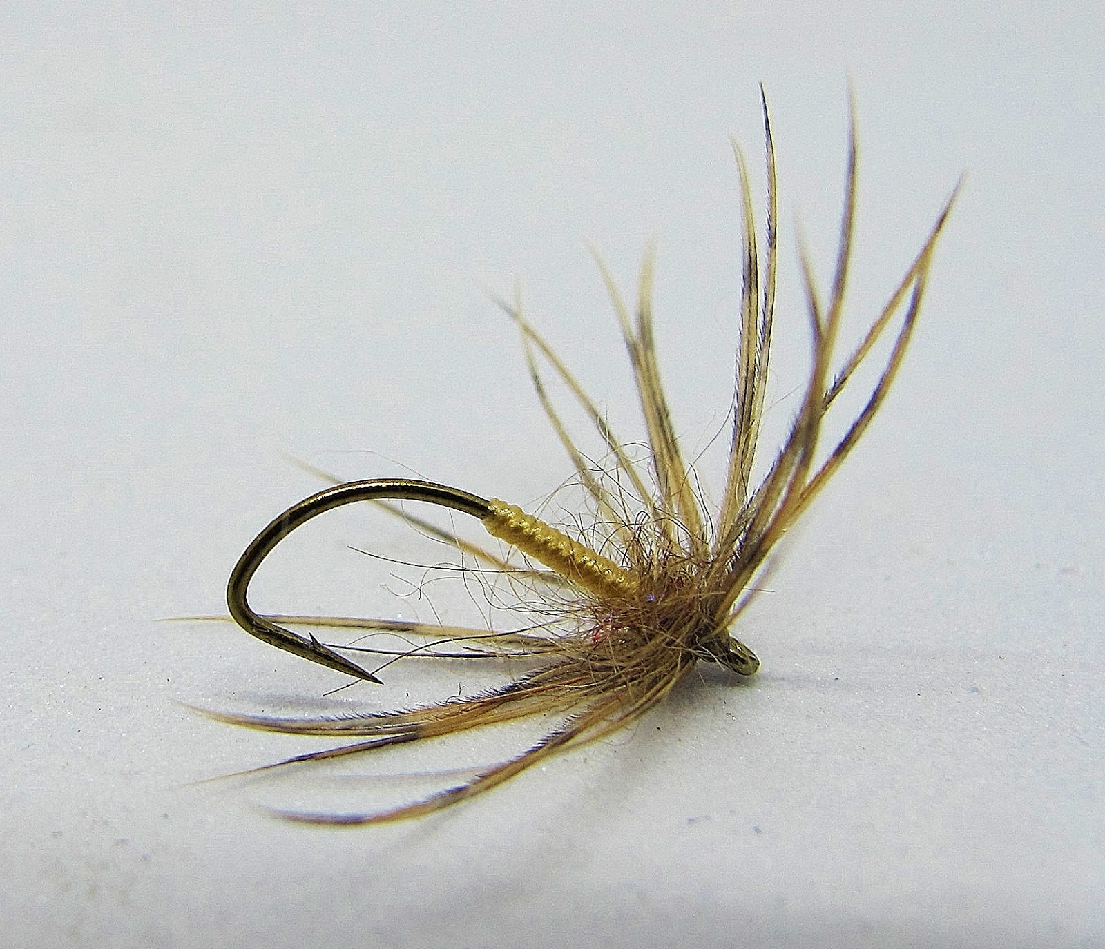 Sunrise ~ hook: #12-#14 ~ thread: tan UNI 8/0 ~ hackle: woodcock shoulder covert ~ body: sunrise yellow size 'A' rod wrapping thread & thorax of brown wool mixed with a bit of Hares mask |